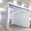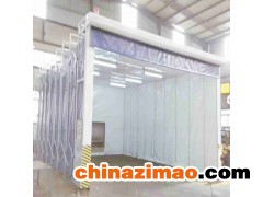 整個伸縮房由以下幾部分構成:門框架、帆布支撐網、剪式伸縮機構、阻燃pvc帆布、驅動機構等部分組成。門框架采用工業型材制成,是驅動電機直接帶動的部分,整個伸縮機構穩定運動的關鍵所在。大門框架上設置有開關按鈕并行程開關,用以自動控制大門的伸縮。除去門框,其余部位就是帆布支撐網,是阻燃帆布安裝連接的骨架,由多組型材骨架構成,并通過剪式伸縮機構將整個相對獨立的骨架連接在一起,形成一個穩定的整體。在每兩個帆布支撐網之間,采用剪式伸縮機構相連,其結構尺寸決定了伸縮量,同時為了***上下都能同時實現伸縮動作,在每側上下各布置一套剪式伸縮機構,兩者之間通過連桿形成一個同步運動機構。在整個網架之間采用工業阻燃pvc帆布,這是形成相對封閉作業間的“墻板”,也是***空氣有序流動的“房體”。安裝時每兩個支撐網采用一塊工業帆布。在噴漆室的大門上安驅動部分。驅動部分采用減速電機,傳動到多節長軸上,再由長軸兩端鏈輪同步傳動到兩側主動輪上。整個驅動前進、后退采用保護:雙向兩級行程保護軌道終端設置限位車擋;門柱上邊有控制盒,操作方便。