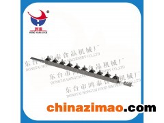 A.原料經攪拌后投放入位于機器上方的鋪料機的料斗中(一次投放約5kg左右),鋪料機自動地將料均勻地鋪在輸送帶上,然后經兩道壓輥壓制達到所需的厚度要求后送至宗、橫切刀進行切制成型,已切制成型的鍋巴再由過渡輸送帶均勻地鋪到由機器后方傳動的烘箱烘盤上,從而完成鍋巴的成型工序。
