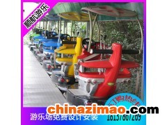太空漫步是一種創意新穎的架空游覽車類游樂設備,即保留了腳踏車的前行動能,又增加了自動駕駛功能,當游客蹬累時,可換到自動檔,車體自動前行,同時,行進中游客通過儀表盤上的按鍵選擇喜愛的樂曲,在音樂中漫步青云,心曠神怡。在行進中游客通過方向盤使車體360度旋轉,欣賞四周的美景,為了經營方便,國體上設置了感應裝置,當后車追上前車時,前車自動由腳踏檔變為自動前行,使節假日車的行駛流暢,增加了單位時間的客容量。太空漫步外形設計仿佛來自太空的飛行器,新穎時尚。