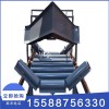 電液動犁式卸料器以電液動推桿為動力源,帶動框架前進,完成犁頭下落,并支承平托輥,犁刀下緣與膠帶貼合,完成卸料。完華后,框架后退,犁頭上抬,變形托輥恢復槽形,膠帶則則恢復槽形,物料平穩通過。