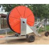 移動絞盤式噴灌機噴頭小車上裝有牽引杠、小車輪、噴頭架,噴頭架上裝有噴頭、配重體、輸水軟管;其特征在于,輸水軟管的另一端與管路連接,并直通PE管;主機架上裝有螺旋千斤頂、護罩、伺服機構、停機碰頭、支腿、收車架,大車輪裝在主機架的兩側;轉盤上裝有底座,底座上裝有右支架、左支架,左支架 側板上裝有直流可調式水蝸輪;水蝸輪的出水口與絞盤主軸管道相通,水蝸輪的入水口與輸水管快速管接頭相通;在快速管接頭上有一水壓表,水蝸輪的調整桿與速 度微調桿機構連接,自動停機連桿與減速器上的速度變 檔機構相連,減速器架上裝有速度表,減速器輸出軸上裝有制動器、左端小鏈輪,左端小鏈輪通過左端滾子鏈 傳動給絞盤上的大鏈輪;絞盤上纏繞PE管,絞盤主軸由 左右支架上的軸承支承,絞盤主軸右端上的小鏈輪通過 右端滾子鏈傳動給排管機構。