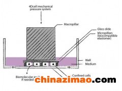動態單元限制器是一種允許以微米精度將單元限制在兩個表面內的裝置。兩個表面之間的空間由微PDMS支柱控制。微柱在玻璃載玻片中制造,其附接到PDMS活塞(吸盤)。活塞由真空泵控制,因此也限制了約束的高度。該裝置可用于培養皿,玻璃基板等。
