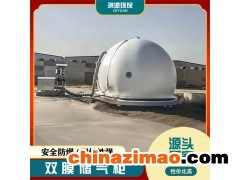 雙膜氣柜外形為3/4、1/2球體,由鋼軌固定于水泥基座或厭氧罐頂上。主體由特殊加工聚酯材質制成,罐體由外膜、內膜、底膜及附屬設備組成,具有抗紫外線及各種微生物的能力,防火耐高溫。